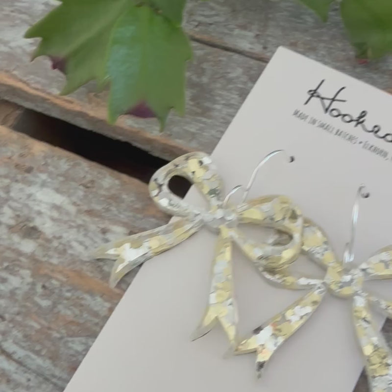 Exude confidence and command attention with our Main Character Energy Bow Earrings. Crafted from smooth acrylic, these eye-catching stunners give you that definitive vibe you've been looking for. Infused with oversized metallic sparkles in both silver and gold, these earrings will elevate any outfit and give you the main character energy you deserve.