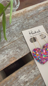 Shine bright and stand out with our Vivacious Heart Earrings! These bold and beautiful earrings feature a confetti design in vibrant shades of magenta, red, gold, blue, pink, and green. Wear them to add a playful touch to any outfit and let your daring spirit shine!