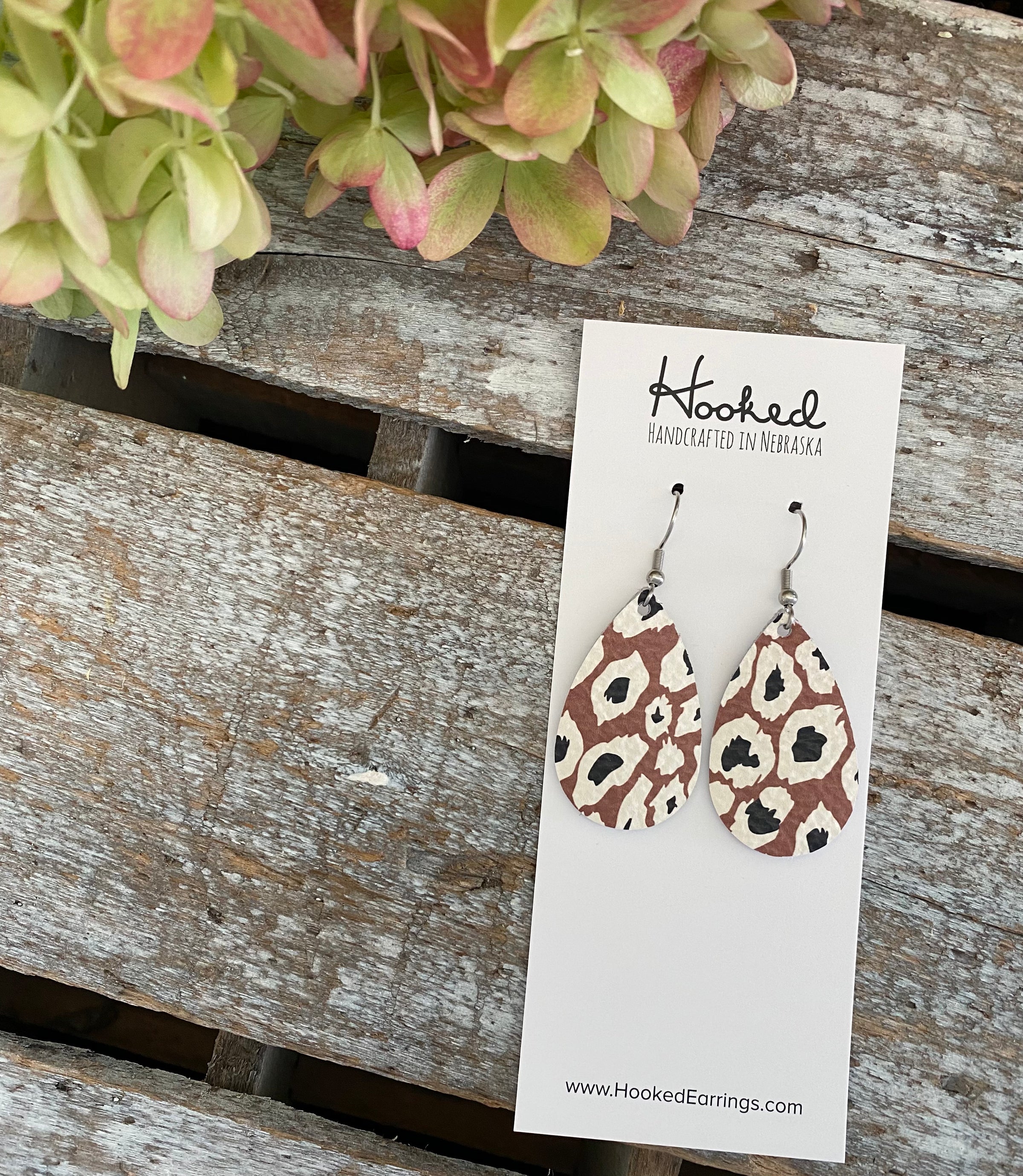 Made with genuine leather and hypoallergenic stainless steel hooks. Each cut of the leather is a bit different, so every earring is one of a kind.