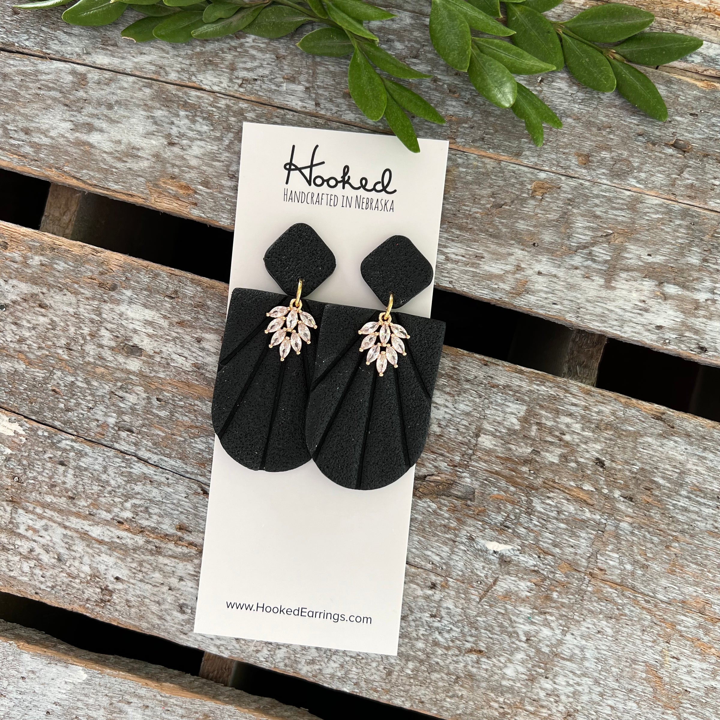 A textured jet black clay design. This one is finished with beautiful, sparkling pave rhinestones with a gold tone setting and is topped by a black stud.