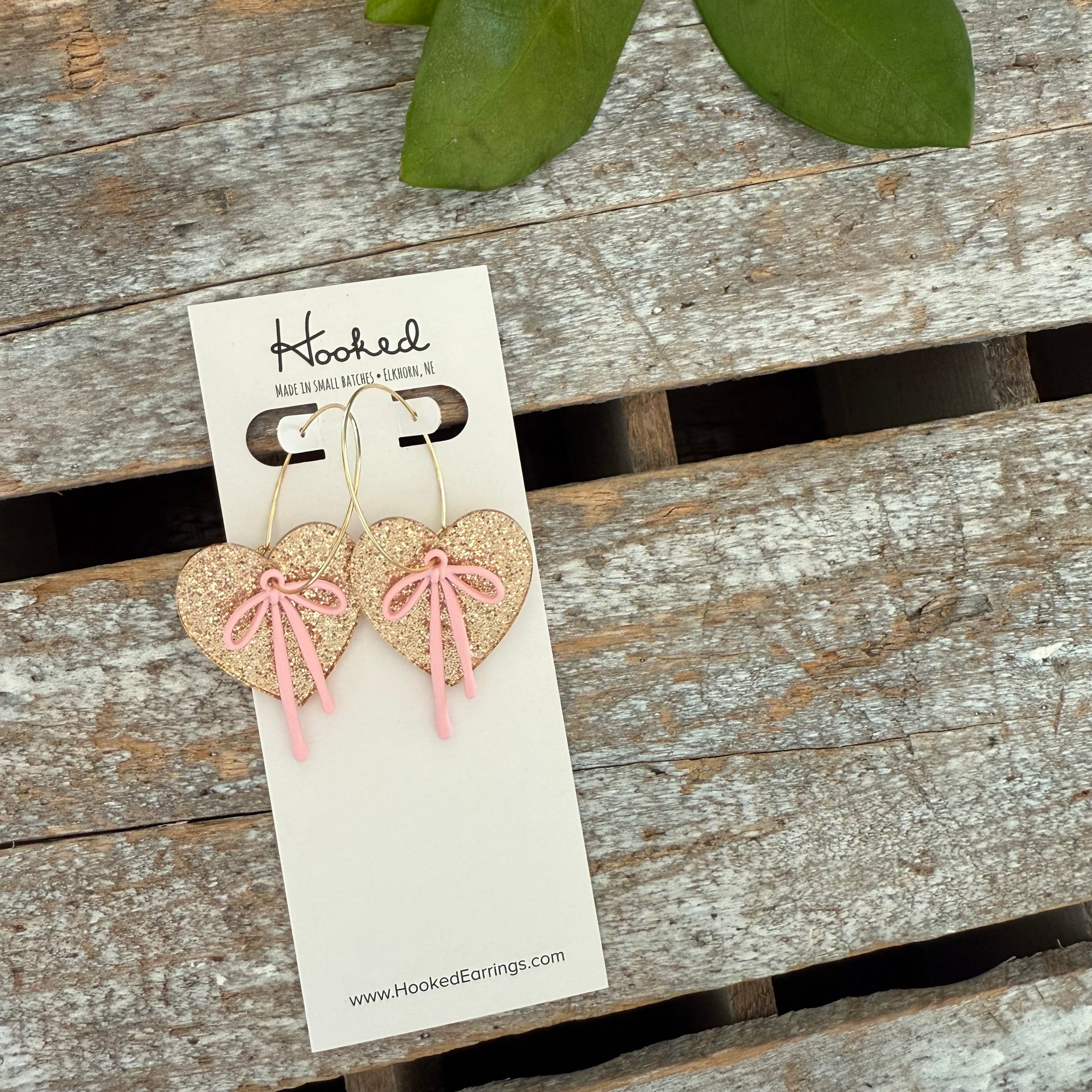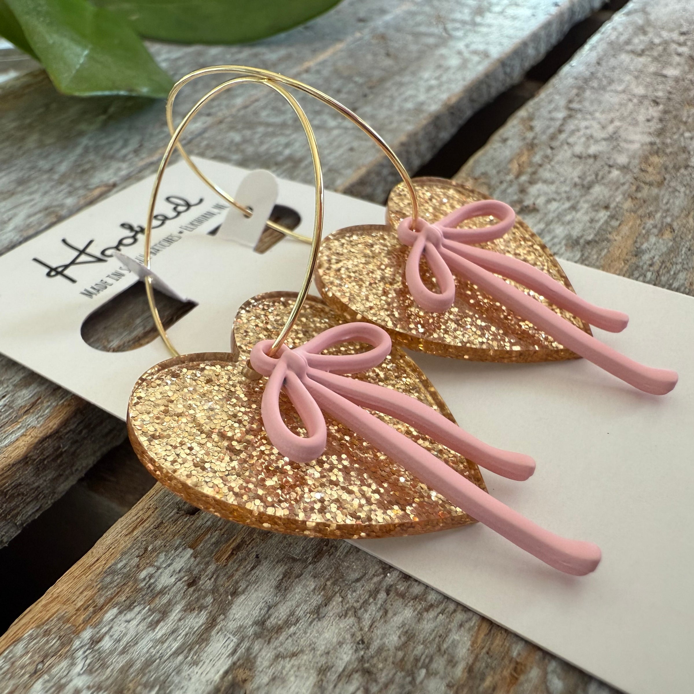 Bring an extra touch of elegance to any outfit with our Demure Bow and Heart Earrings. The glittery gold hearts are layered under a loopy pink bow, dropped from a golden hoop, creating a beautiful and demure look. Add these earrings to your collection for a sophisticated and exclusive touch.