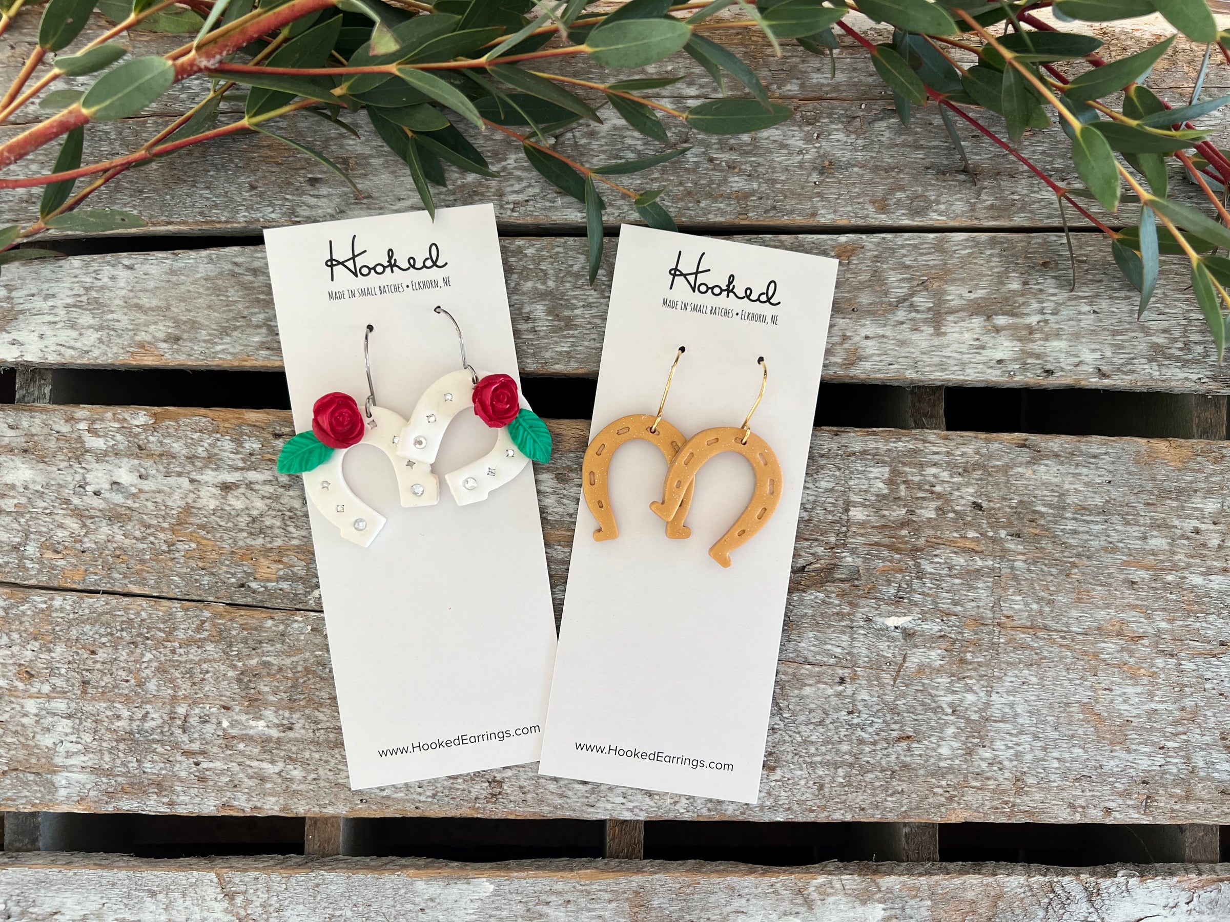 They are on golden hypoallergenic stainless steel hooks so they are perfect for sensitive ears, and measure just under 2” from the top of the hook to tip.