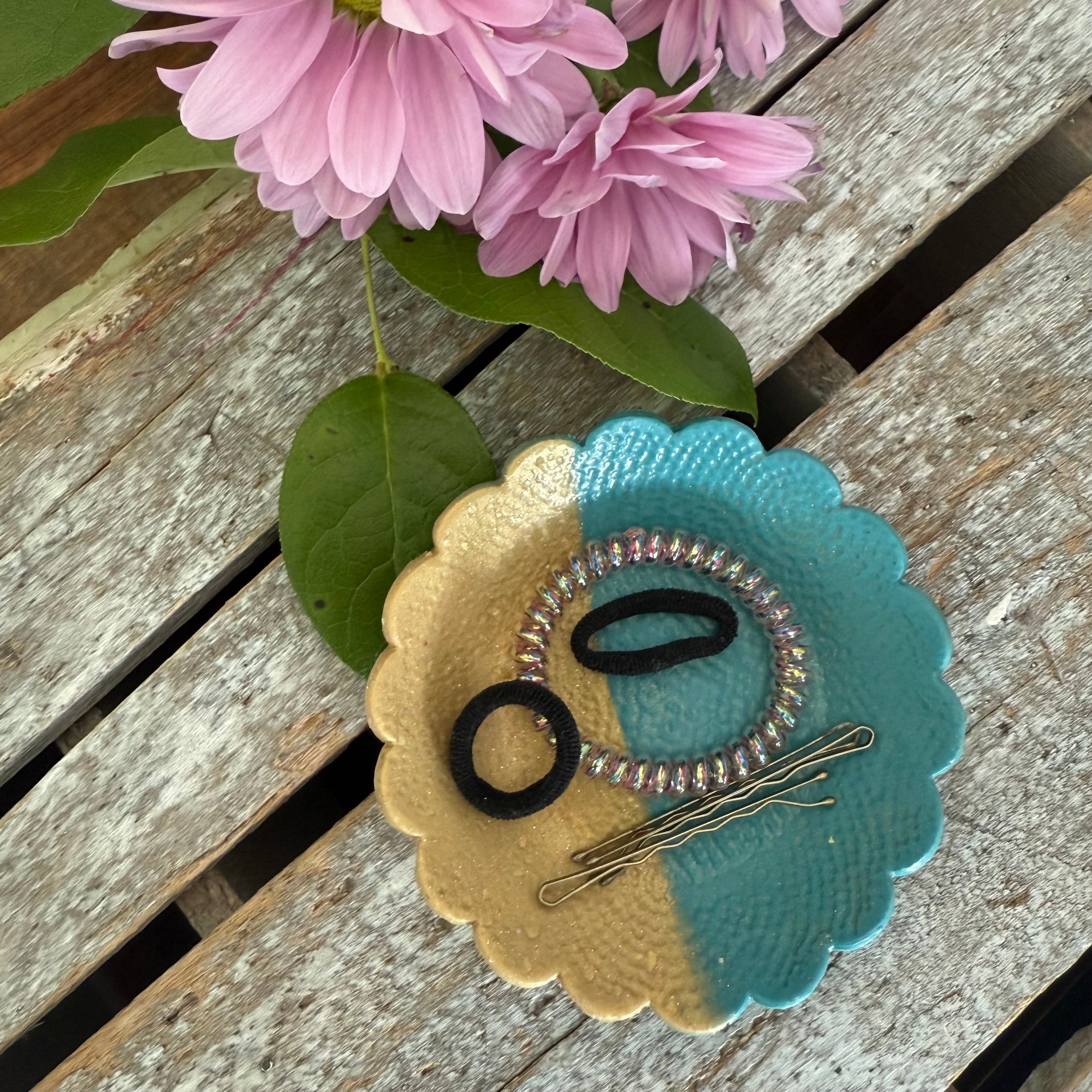 Never lose track of your small valuables again with our Scalloped Ring Dish! This versatile dish is perfect for storing not just rings, but also AirPods, loose change, earrings, hair accessories, necklaces and bracelets, keys, paper clips, and more. Keep your belongings organized and easily accessible in one stylish and compact place.