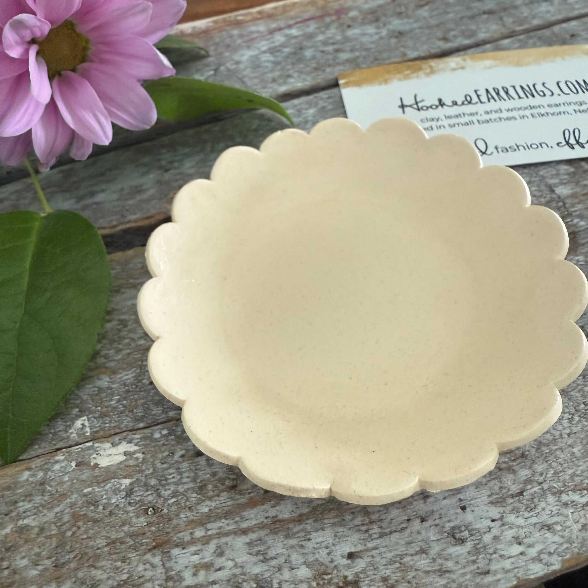 Never lose track of your small valuables again with our Scalloped Ring Dish! This versatile dish is perfect for storing not just rings, but also AirPods, loose change, earrings, hair accessories, necklaces and bracelets, keys, paper clips, and more. Keep your belongings organized and easily accessible in one stylish and compact place.