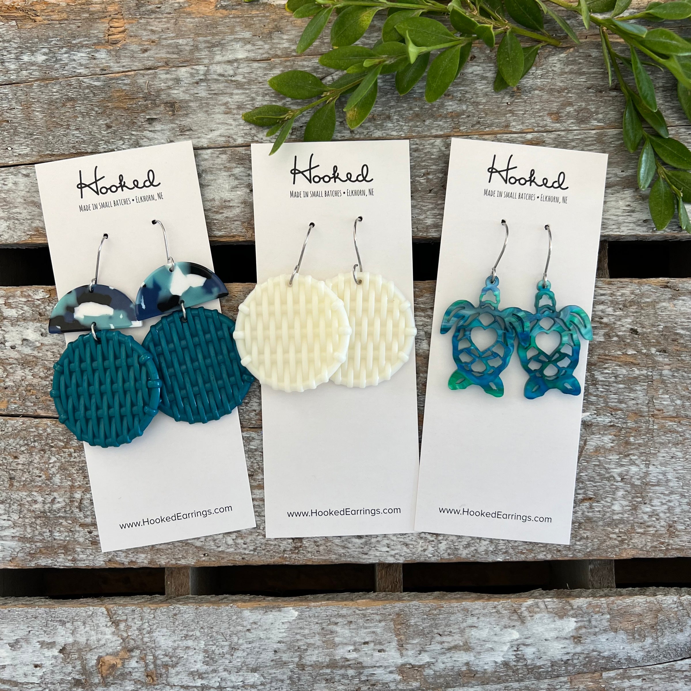 Sleek, shiny, and super fun acrylic earrings, totally waterproof! Shades of blue, green, and silver are marbled together in a tortoise shell fashion; each earring is unique so the colors and placement will vary. These earrings are just over 2 inches long, including the hook.