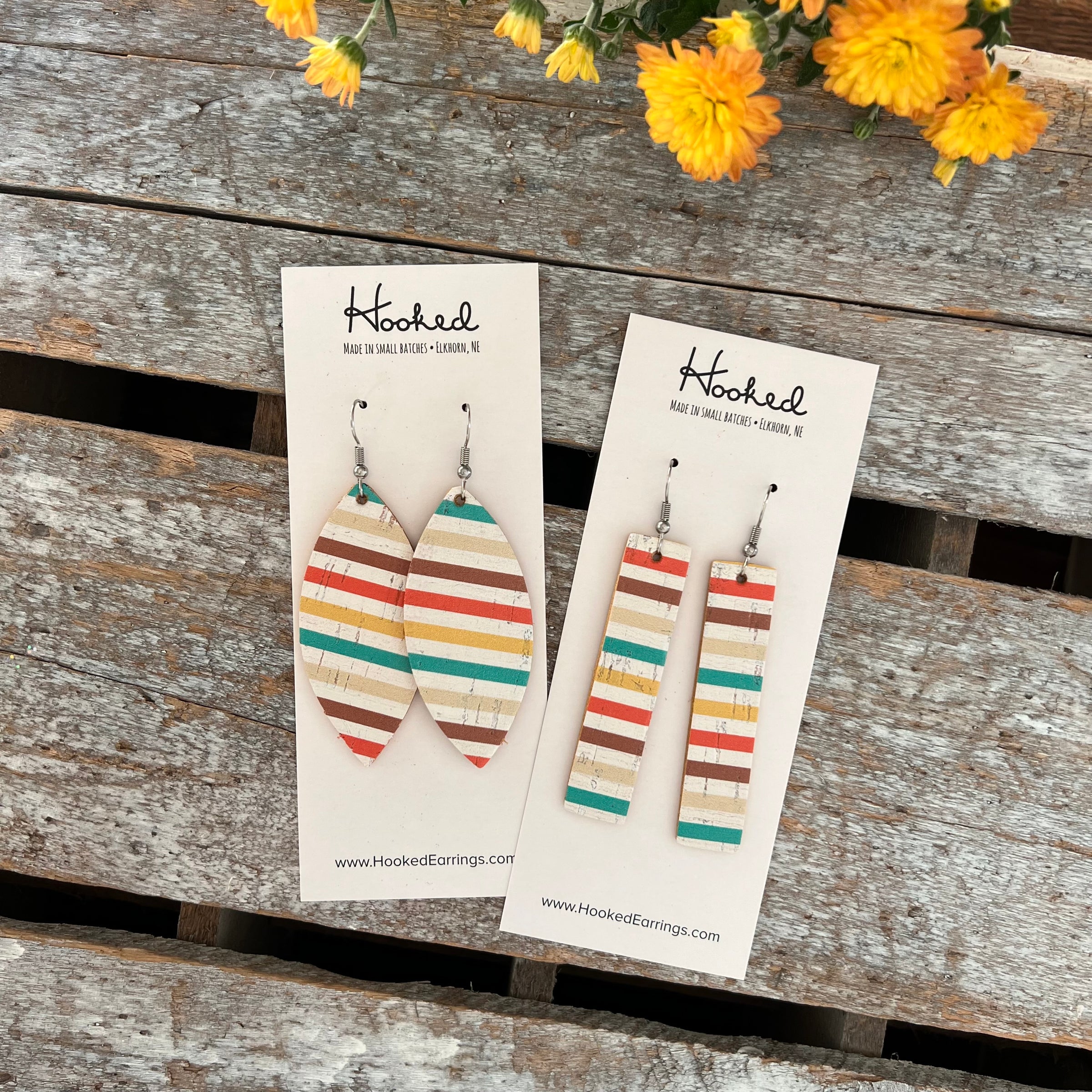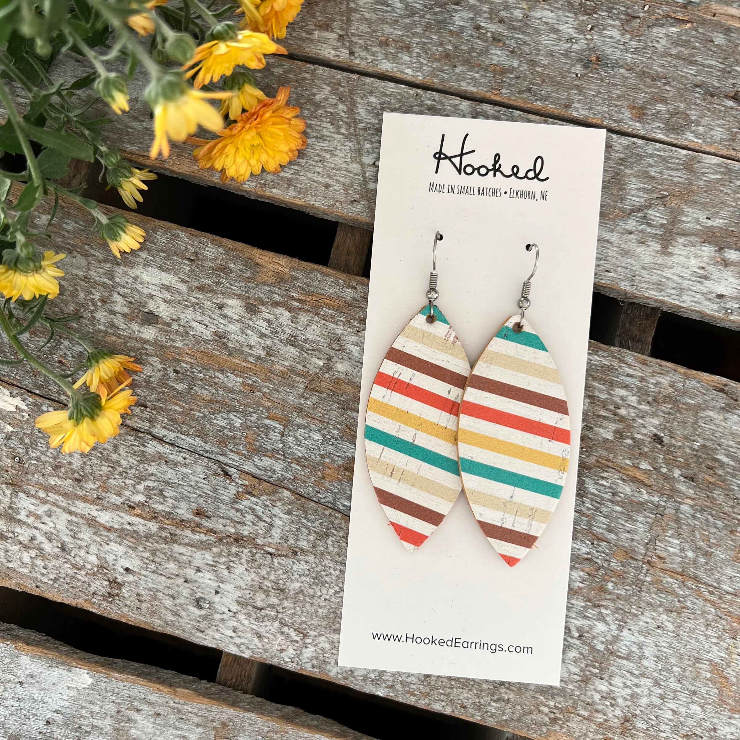 Made with genuine cork, genuine leather, and hypoallergenic stainless steel hooks. Due to the nature of this print, each earring will be one of a kind but I do my best to match stripes!