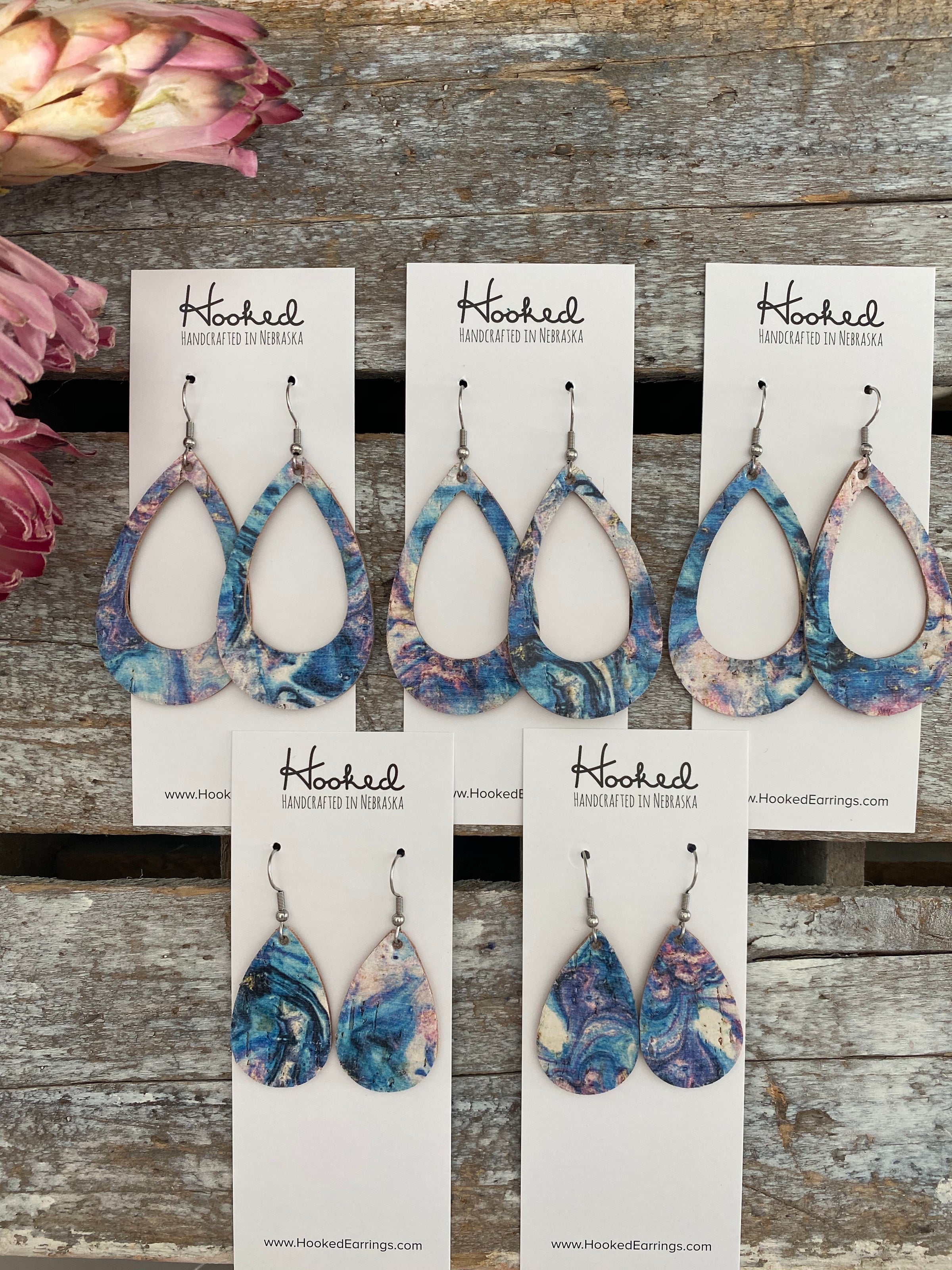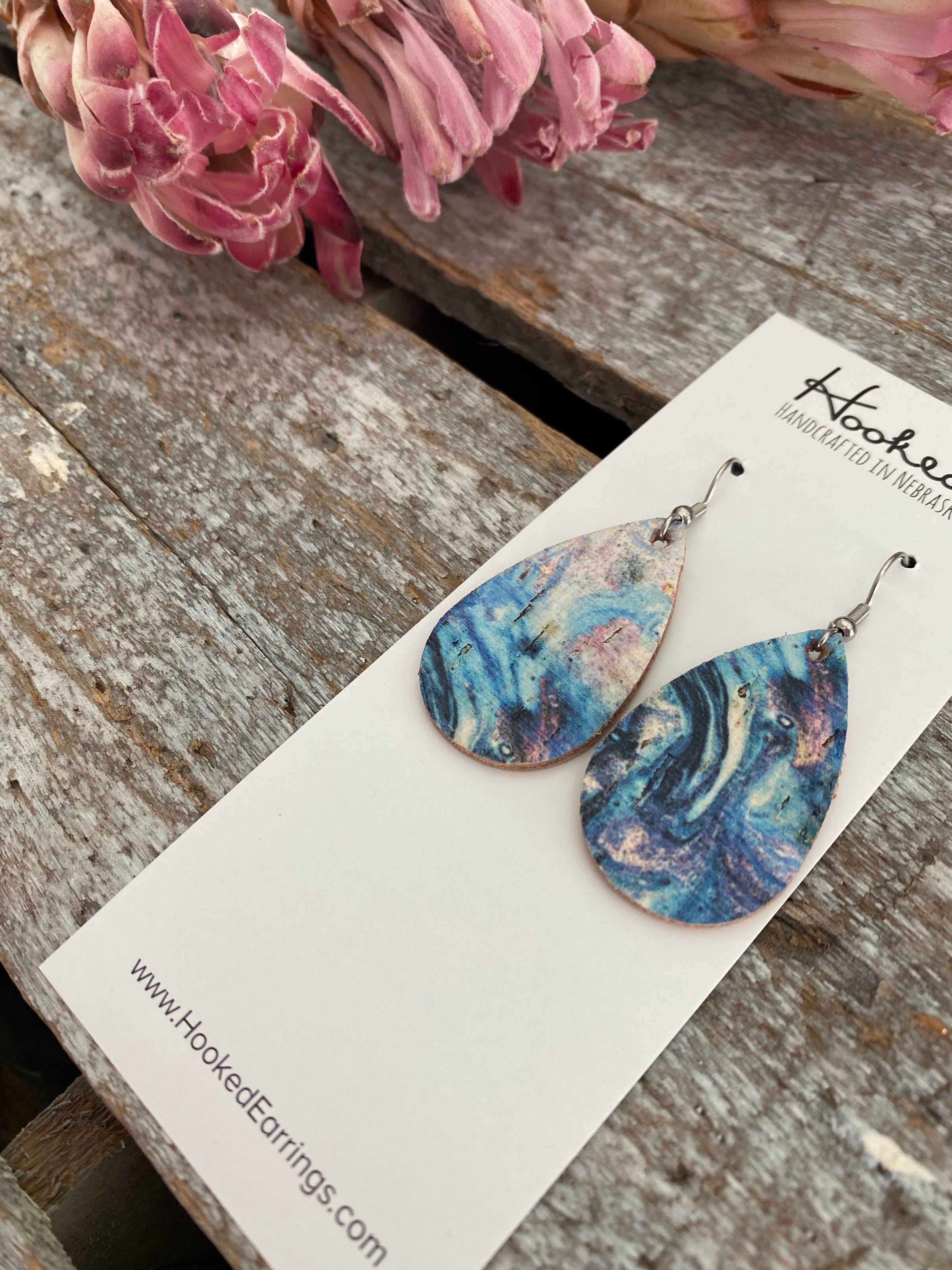 A new twist on that ever-popular Space Unicorn leather - this time in CORK! Watercolor-like swirls and blotches cover the cork to create a cosmic feel ... various shades, including purple, blue, yellow, green, pink, and aqua depending on the exact cut. Each cut of the leather is a bit different, so every earring is one of a kind — especially in this size! Some cuts will be mostly pink, others mostly blue